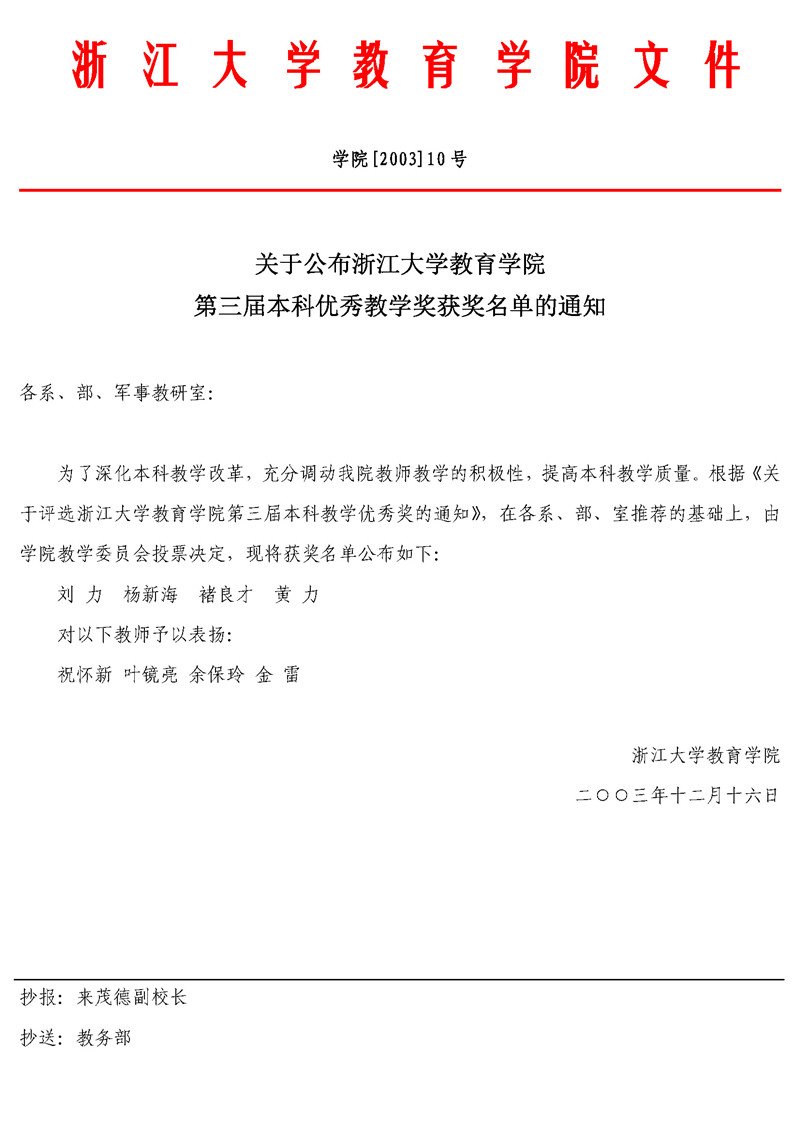 学院[2003]10号 关于公布浙江大学教育学院第三届本科优秀教学奖获奖名单的通...