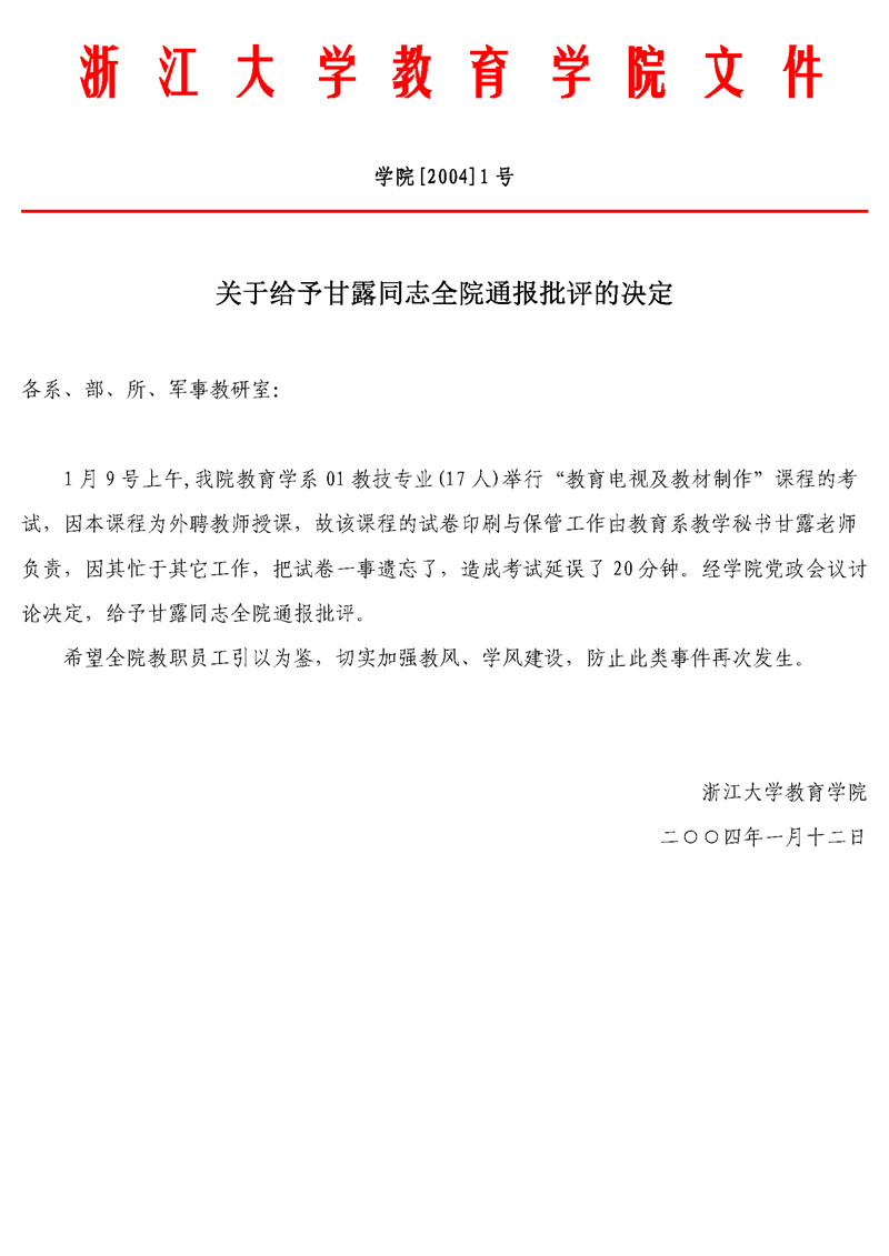 学院[2004]1号 关于给予甘露同志全院通报批评的决定