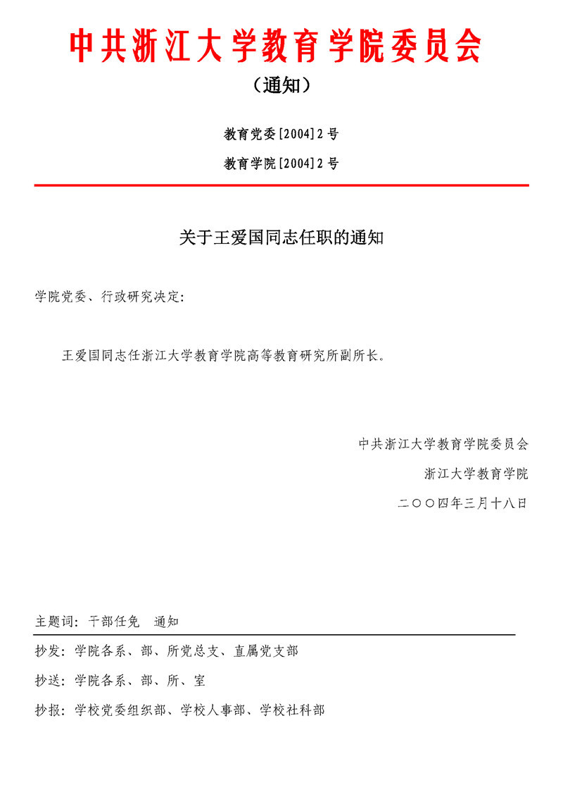 教育党委[2004]2号 关于王爱国同志任职的通知