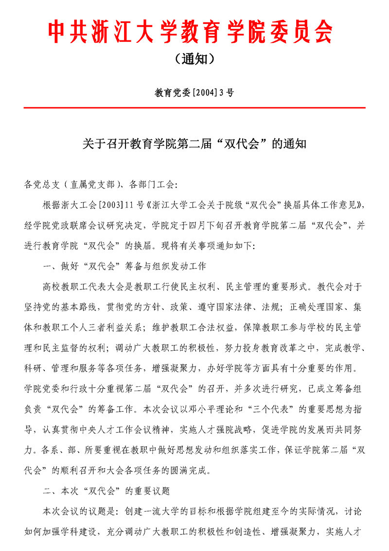 教育党委[2004]3号 关于召开教育学院第二届“双代会”的通知