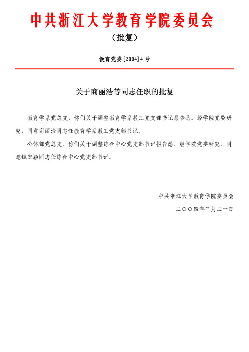 教育党委[2004]4号 关于商丽浩等同志任职的批复