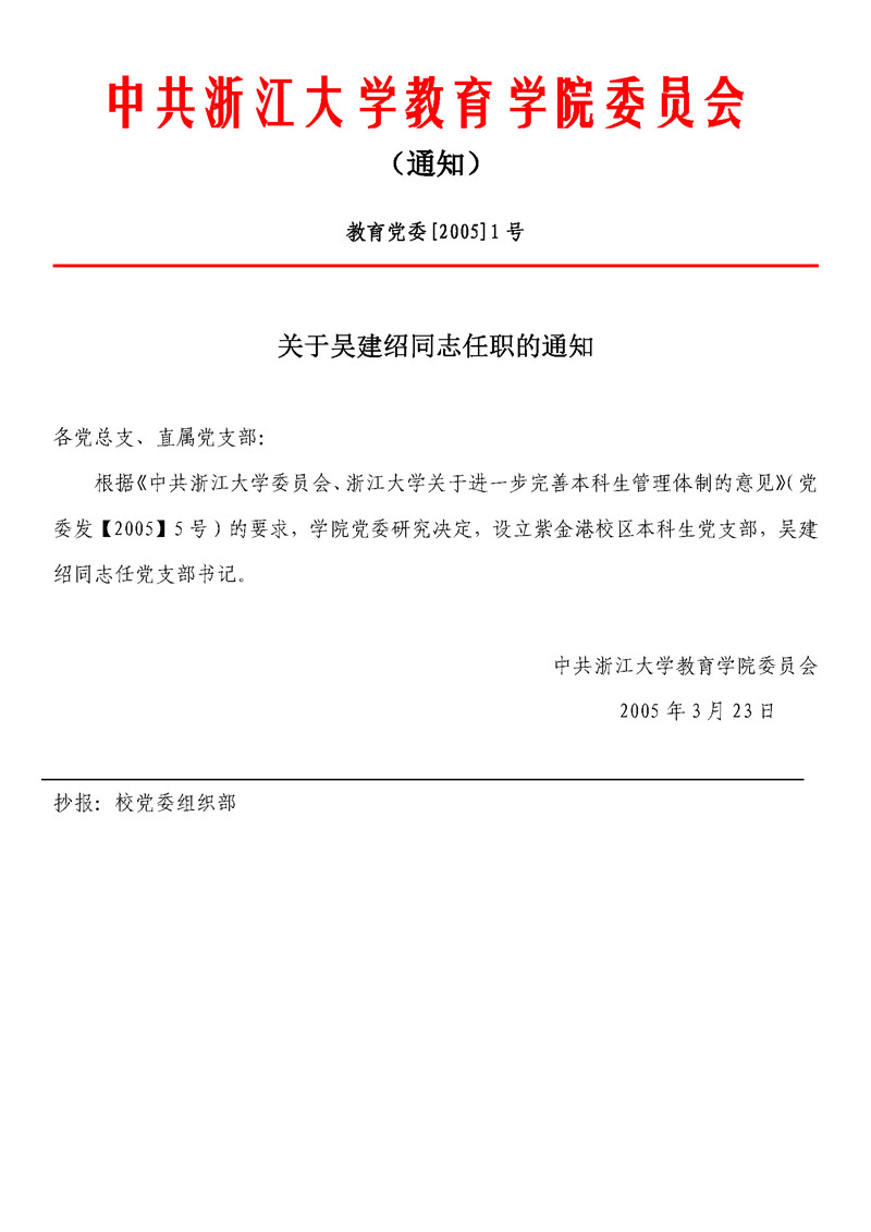 教育党委[2005]1号 关于吴建绍同志任职的通知