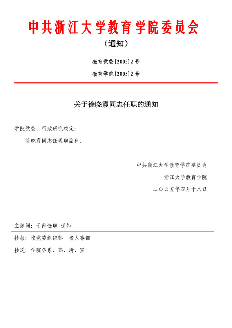 教育党委[2005]2号 关于徐晓霞同志任职的通知