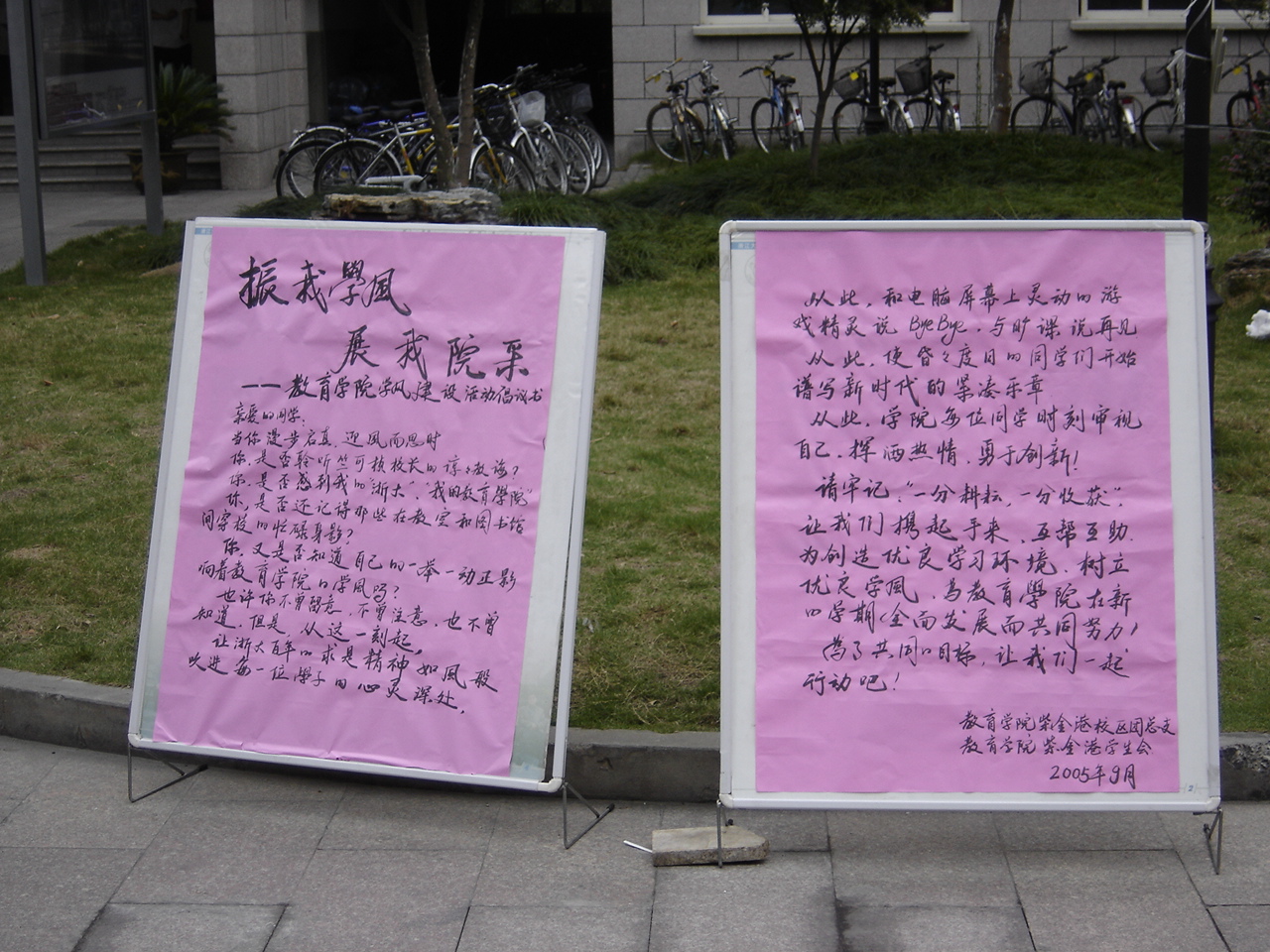 9月23日下午,教育学院紫金港学生会在紫云小广场上拉起了一条十余米长,印有“宝剑锋从磨砺出,梅花香自苦寒来”的横幅,这是“振我学风——展我院采”学风建设系列活动中的一个现场签名活动。