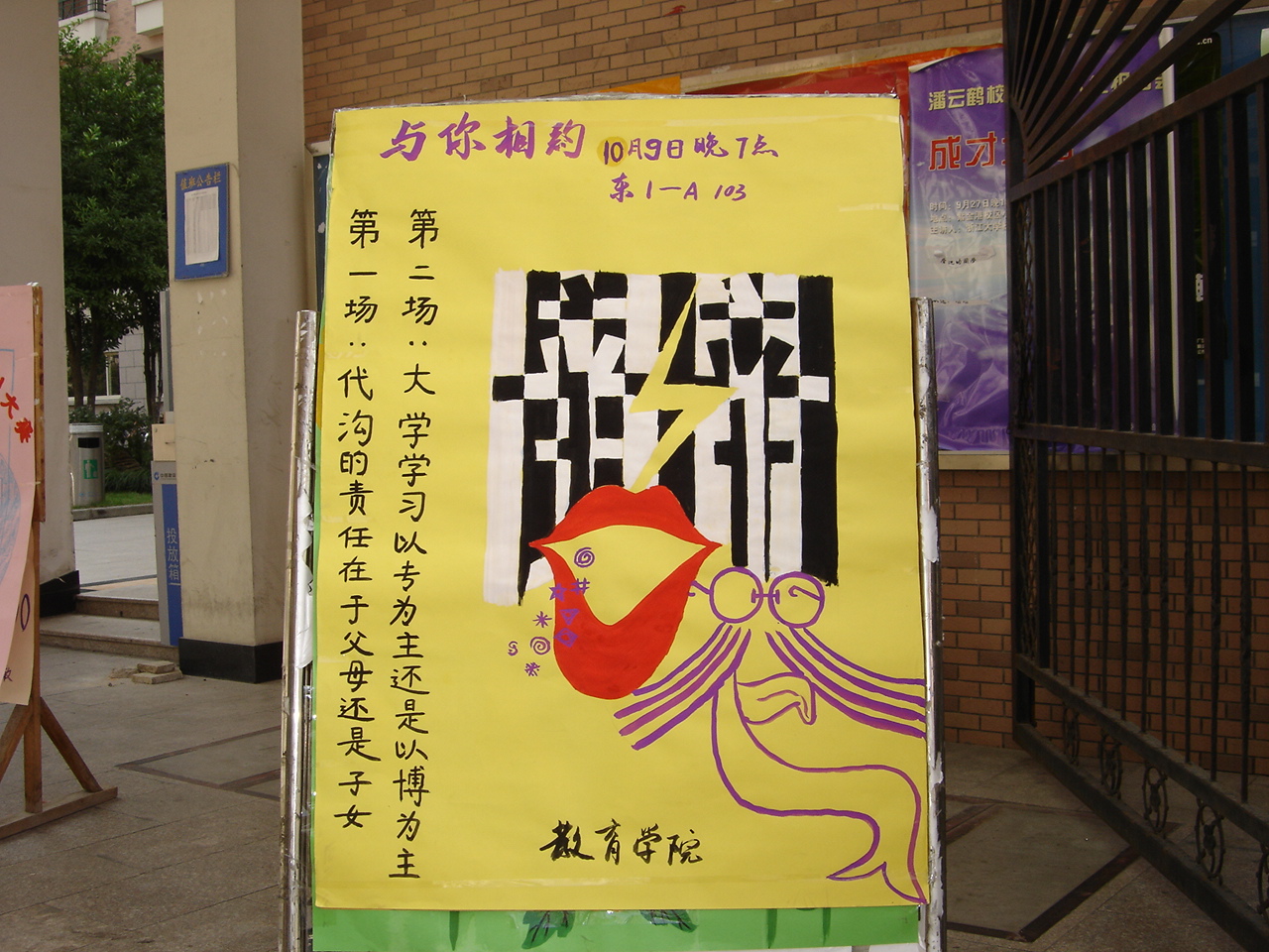 10月9日晚7时,教育学院紫金港校区学风建设月活动之---新老生辩论赛预赛,将在紫金港校区东1A-103教室举行。学院在新生始业教育月之际开展新老生辩论赛,旨在加强教育学院新老生逻辑思辩和口语表达能力,增进不同年级、不同专业同学之间的交流,使学院内学术研究与交流的氛围更为浓厚。比赛采用04级老生与05级新生合并组队,以老生带新生,加强相互之间的交流,各专业之间也采取了交差组队,以加强交流﹑增进友谊。比赛设冠亚军奖和最佳辩手奖。