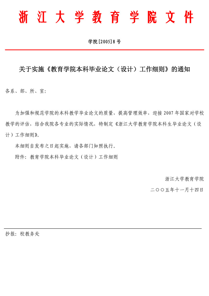 学院[2005]8号 关于实施《教育学院本科毕业论文(设计)工作细则》的通知