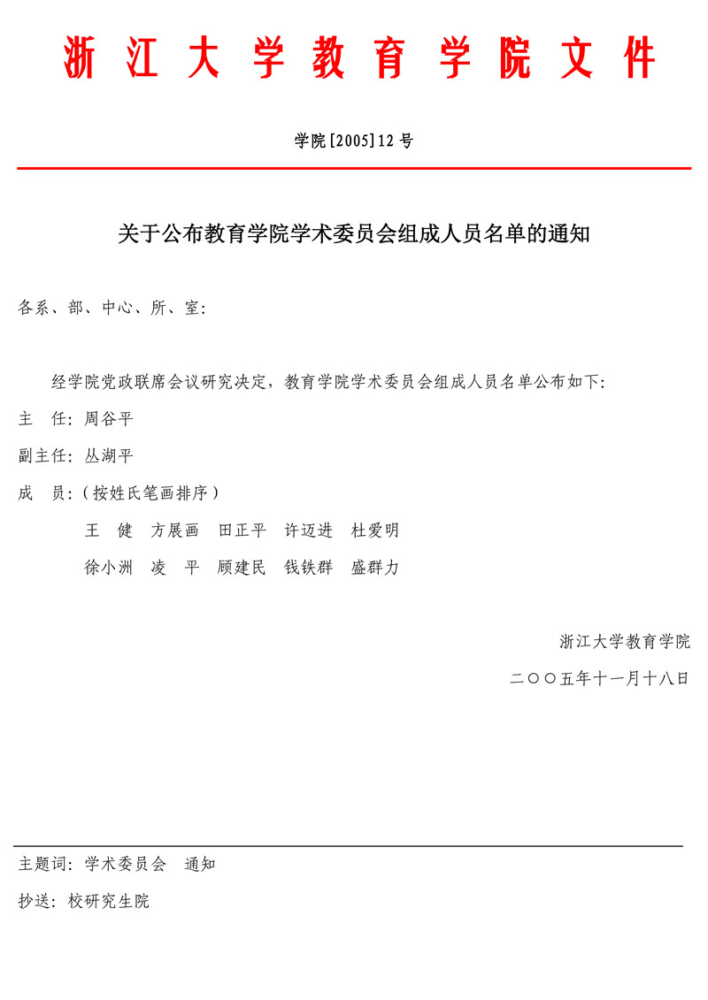学院[2005]12号 关于公布教育学院学术委员会组成人员名单的通知