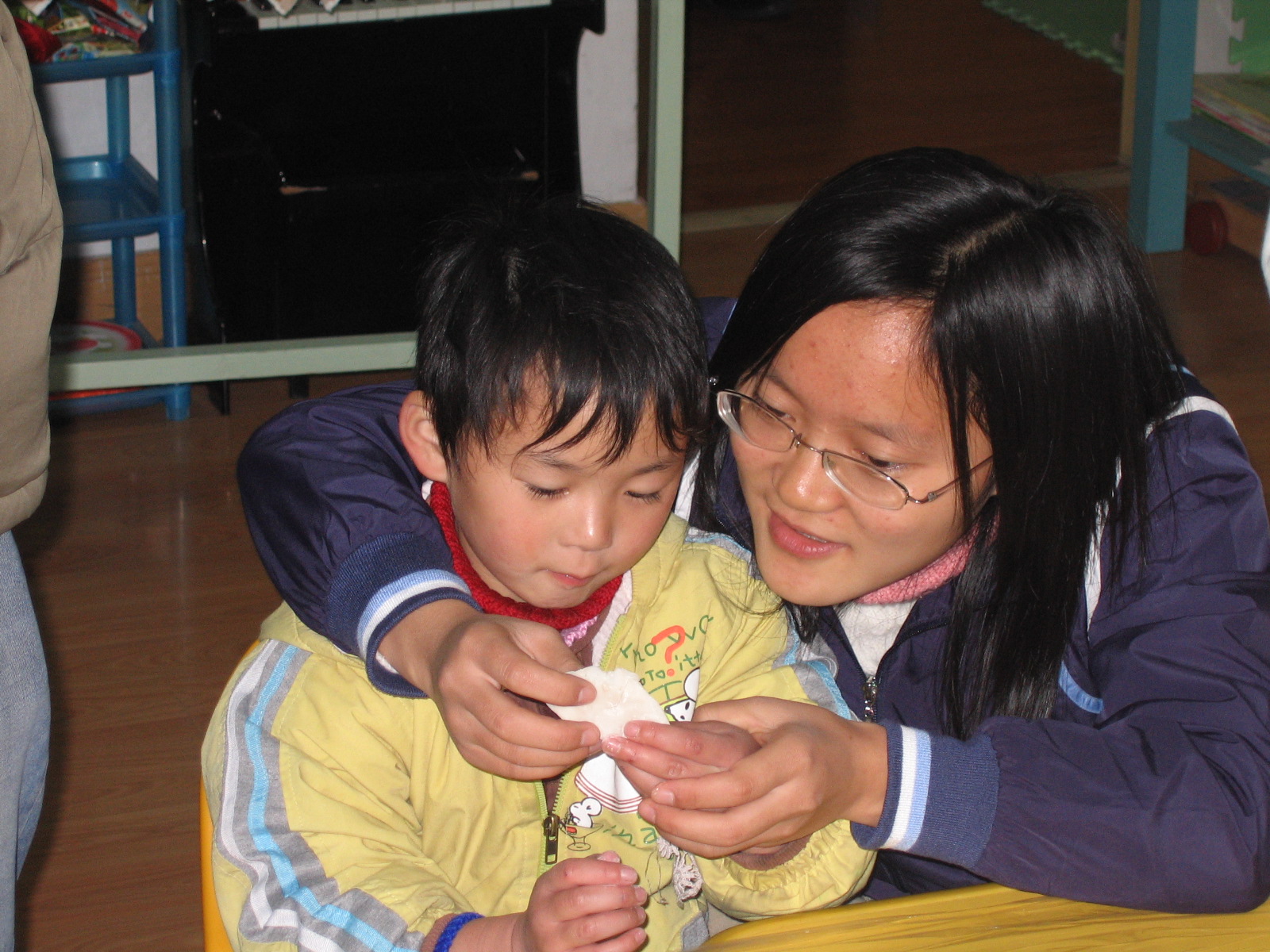 早上的活动很精彩,我们先带小朋友在教室里玩各种玩具。一开始,孩子们还很怕生,跟她们说话没有什么反应。渐渐地,发现在教她们搭积木,玩拼图时,她们有很强烈的说话欲望。我带的那个小女孩,刚进康复中心不久,听力很差,说话也只能发出含糊的声音,根本听不到她说什么。不过,慢慢地经过游戏,她已经能对我微笑,当我用手语跟她说“我爱你”时,她也用手语对我说“我爱你”,当时我真的很感动。
