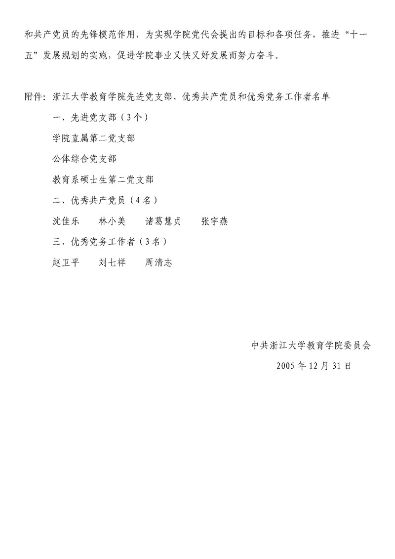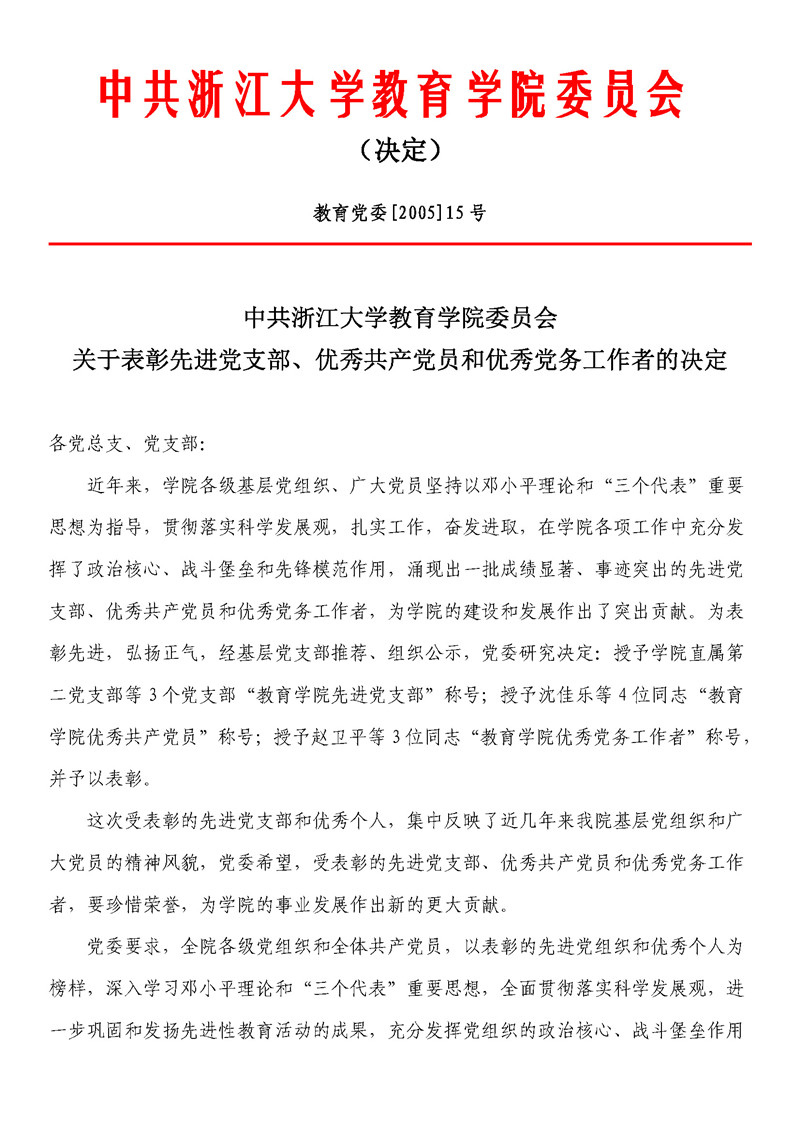 教育党委[2005]15号 关于表彰先进党支部、优秀共产党员和优秀党务工作者的决定