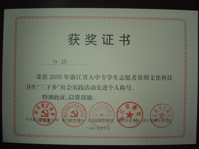 根据中共浙江省委宣传部、浙江省文明办、共青团浙江省委、浙江省教育厅、浙江省学生联合会“关于表彰2005年浙江省大中专学生志愿者暑期文化科技卫生‘三下乡’社会实践活动组织工作奖、十佳团队、优秀团队、先进个人和省级社会实践基地的决定”[团浙联(2005)76号],浙江大学教育学院暑期社会实践“阳光展翅”服务队获得“2005年浙江省大中专学生志愿者暑期文化科技卫生‘三下乡’社会实践活动优秀团队”称号,实践基地获得“2005年浙江省大中专学生志愿者暑期文化科技卫生‘三下乡’社会实践活动省级社会实践基地”称号,陈超获得“2005年浙江省大中专学生志愿者暑期文化科技卫生‘三下乡’社会实践活动先进个人”称号。