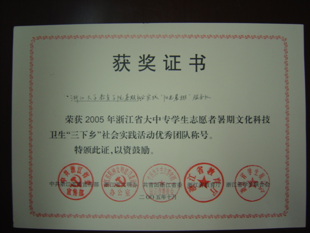 根据中共浙江省委宣传部、浙江省文明办、共青团浙江省委、浙江省教育厅、浙江省学生联合会“关于表彰2005年浙江省大中专学生志愿者暑期文化科技卫生‘三下乡’社会实践活动组织工作奖、十佳团队、优秀团队、先进个人和省级社会实践基地的决定”[团浙联(2005)76号],浙江大学教育学院暑期社会实践“阳光展翅”服务队获得“2005年浙江省大中专学生志愿者暑期文化科技卫生‘三下乡’社会实践活动优秀团队”称号,实践基地获得“2005年浙江省大中专学生志愿者暑期文化科技卫生‘三下乡’社会实践活动省级社会实践基地”称号,陈超获得“2005年浙江省大中专学生志愿者暑期文化科技卫生‘三下乡’社会实践活动先进个人”称号。