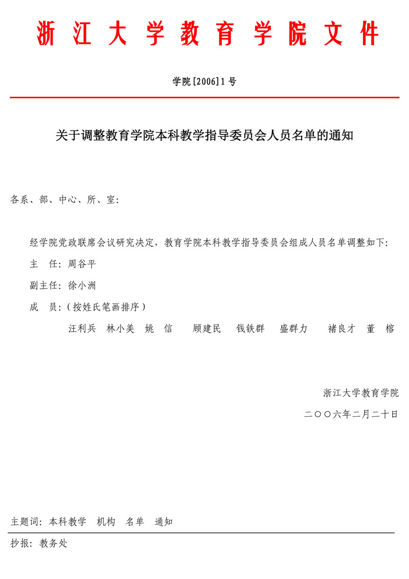 学院[2006]1号 关于调整教育学院本科教学指导委员会人员名单的通知