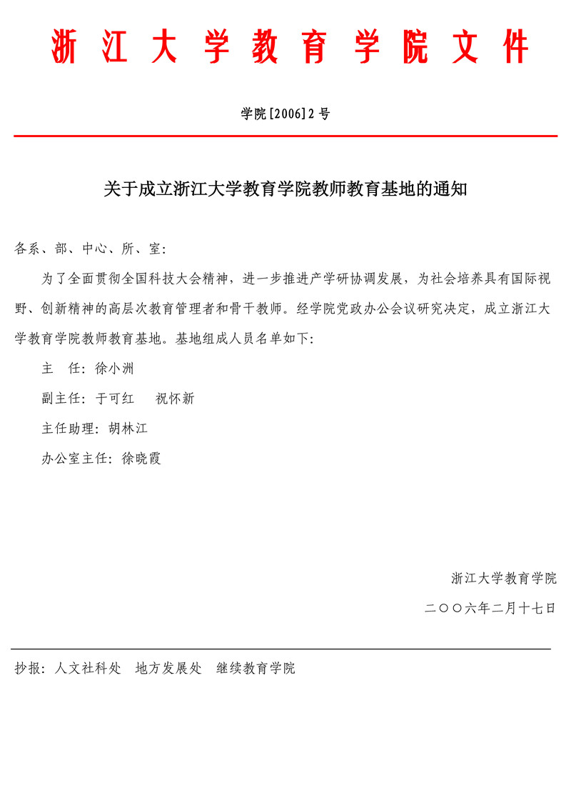 学院[2006]2号 关于公布浙江大学教育学院教师教育基地组成人员名单的通知
