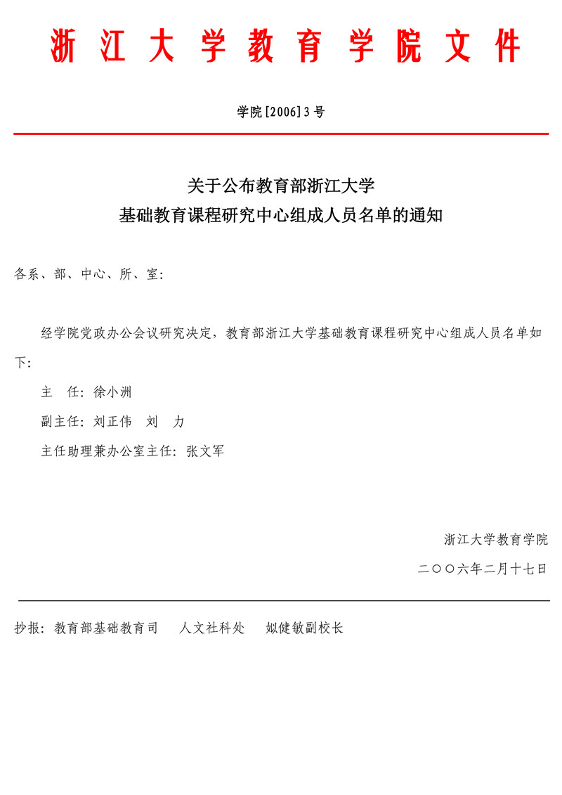 学院[2006]3号 关于公布教育部浙江大学基础教育课程研究中心组成人员名单的通...