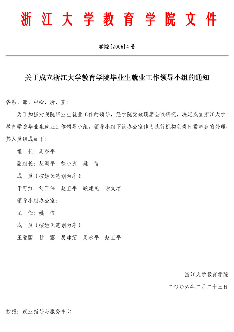 学院[2006]4号 关于成立浙江大学教育学院毕业生就业工作领导小组的通知