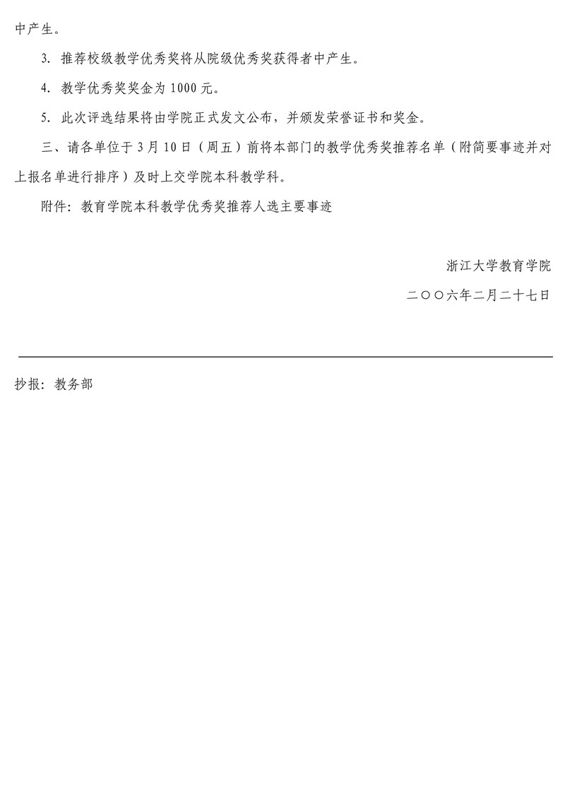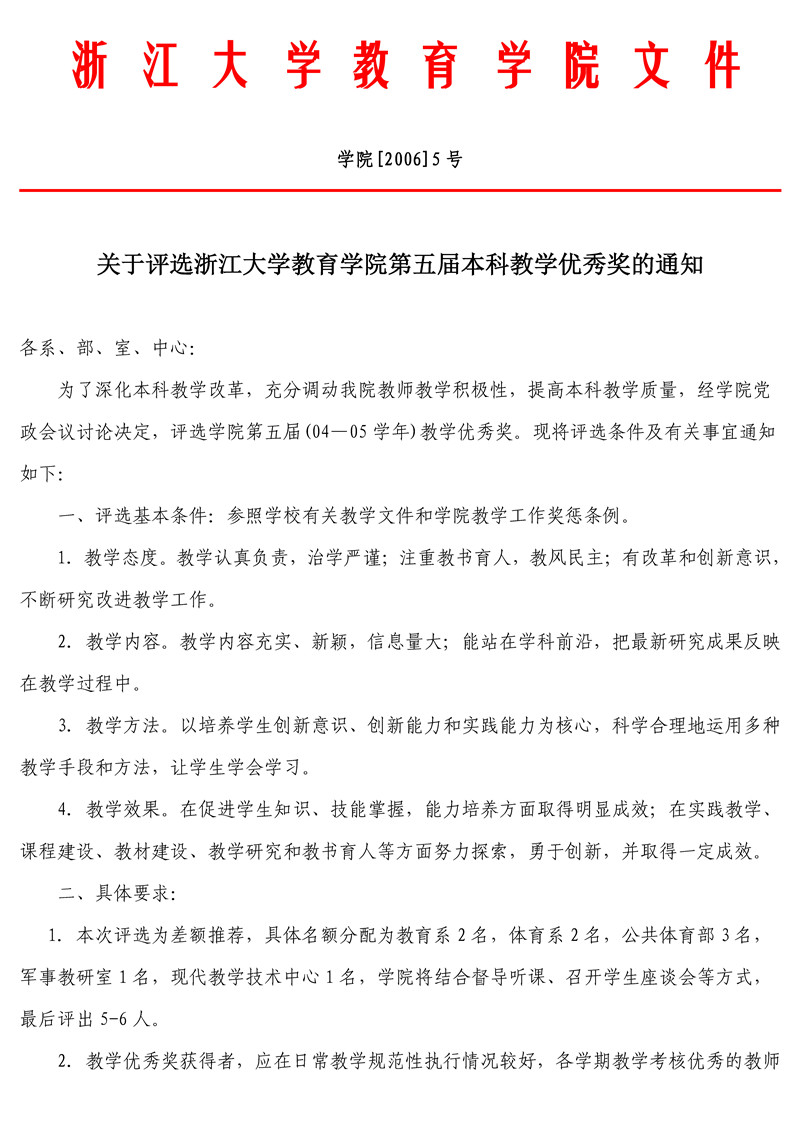 学院[2006]5号 关于评选浙江大学教育学院第五届本科教学优秀奖的通知
