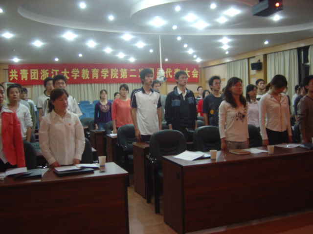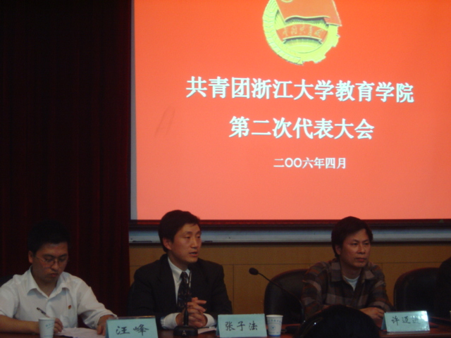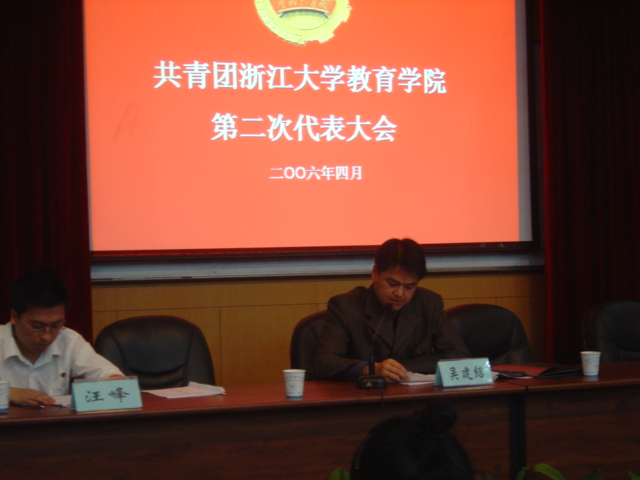 2006年4月4日晚6点30分,共青团浙江大学教育学院第二次代表大会在西溪校区田家炳书院506报告厅隆重召开。教育学院党委书记许迈进、校团委副书记张子法、教育学院党委副书记姚信、校团委宣传部部长江雪梅、法学院团委书记吴卫华、教育学院团委书记吴建绍出席本次大会。大会由教育学院团委副书记汪峰主持,5个代表团共52名团员代表参加了本次大会。