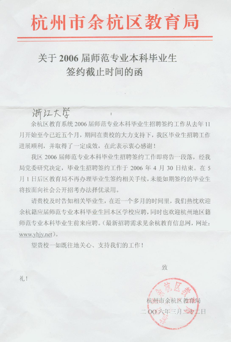余杭区关于师范类毕业生签约截止时间的通知