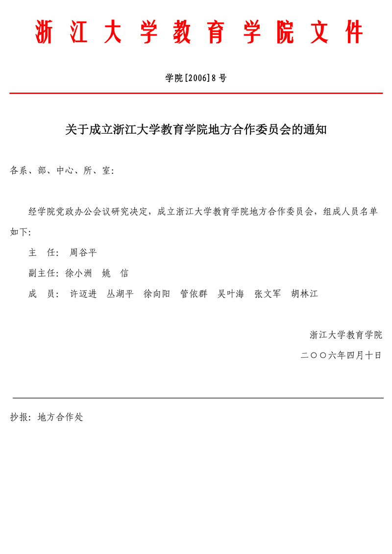 学院[2006]8号 关于成立浙江大学教育学院地方合作委员会的通知