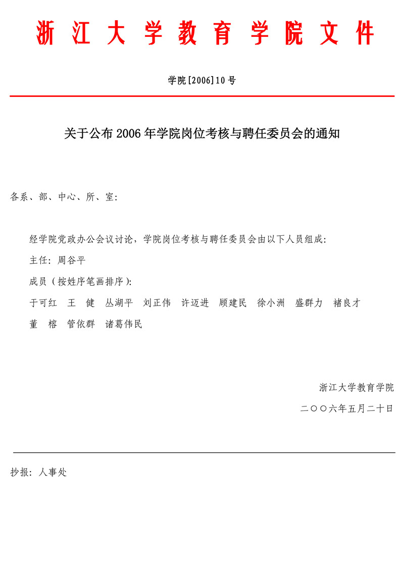 学院[2006]10号 关于公布2006年学院岗位考核与聘任委员会的通知
