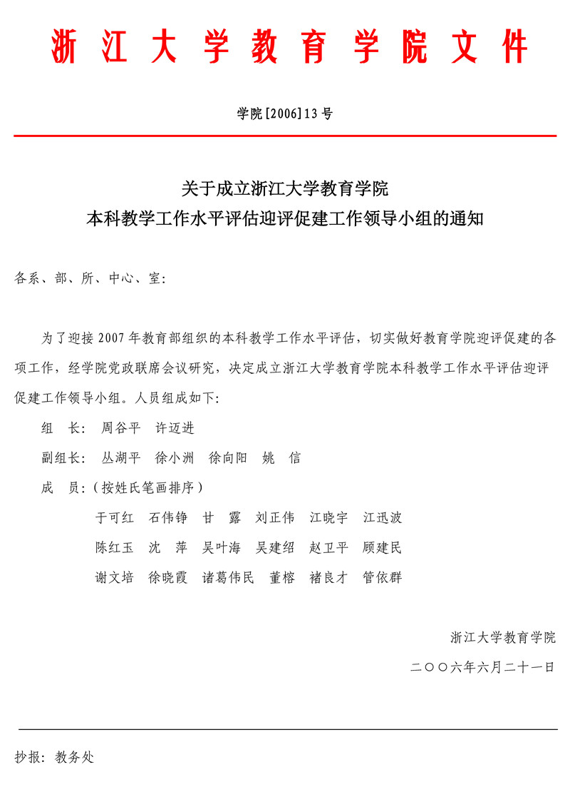 学院[2005]13号 关于成立浙江大学教育学院本科教学工作水平评估迎评促建工作...