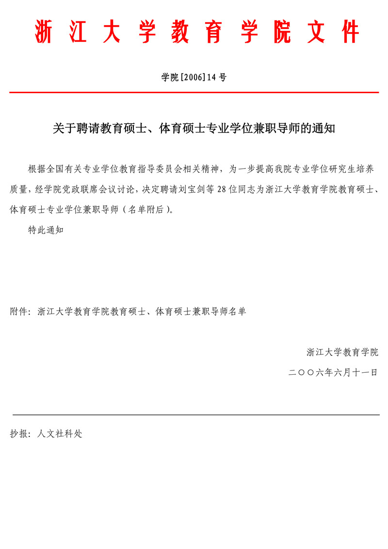 学院[2006]14号 关于聘请教育硕士、体育硕士专业学位兼职导师的通知