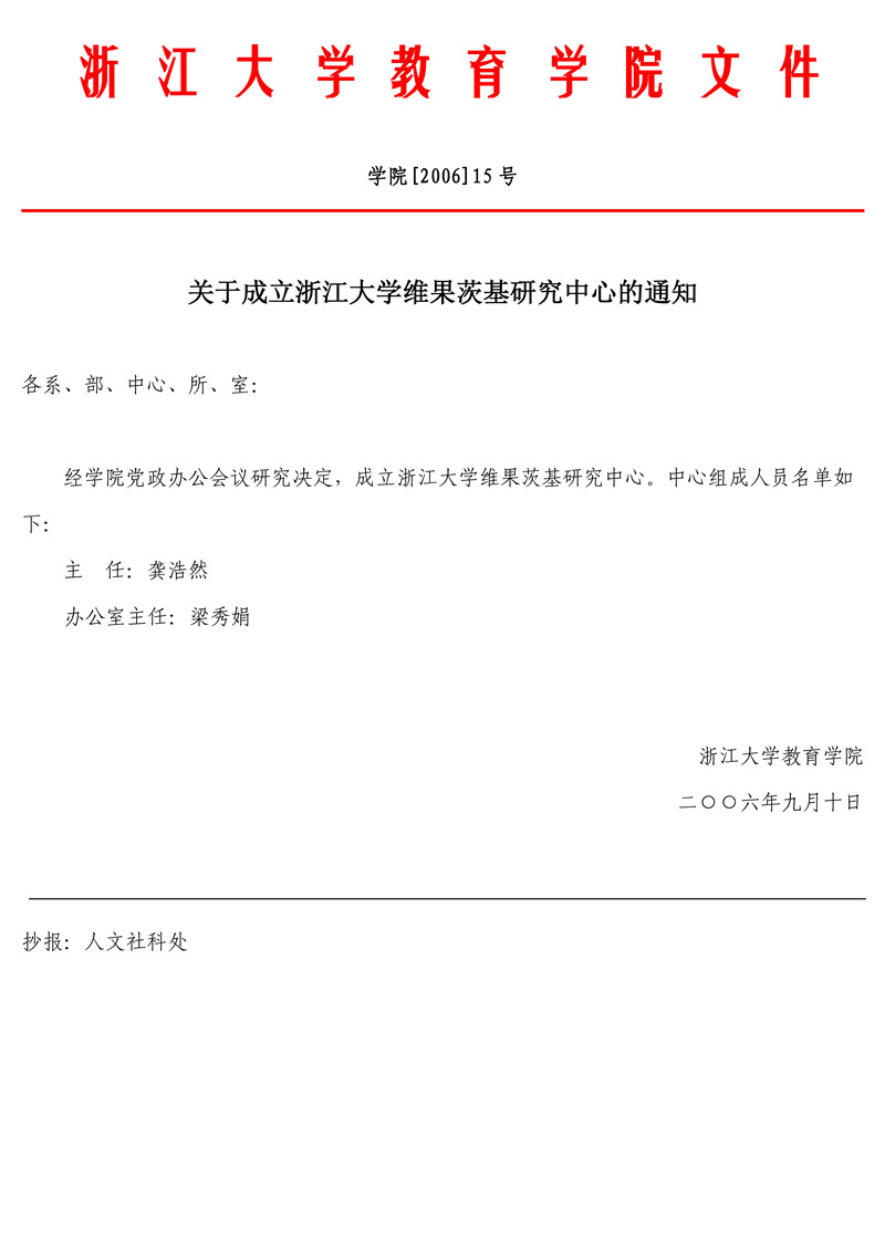 学院[2006]15号 关于成立浙江大学维果茨基研究中心的通知