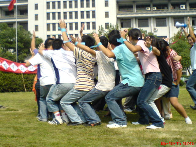 最后一个环节“动力火车”。大家围成一个圈,前面的同学坐在后面同学的腿上,后面的支撑前面的,前面的支撑再前面的,看哪队坚持时间最长。一个集体就应是这样,你支持了别人,别人也支持了你,只有相互支持,才能发展得更好。