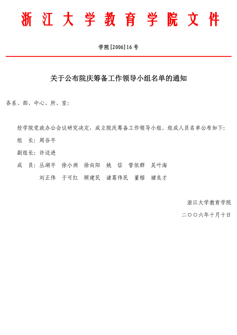 学院[2006]16号 关于公布院庆筹备工作领导小组名单的通知