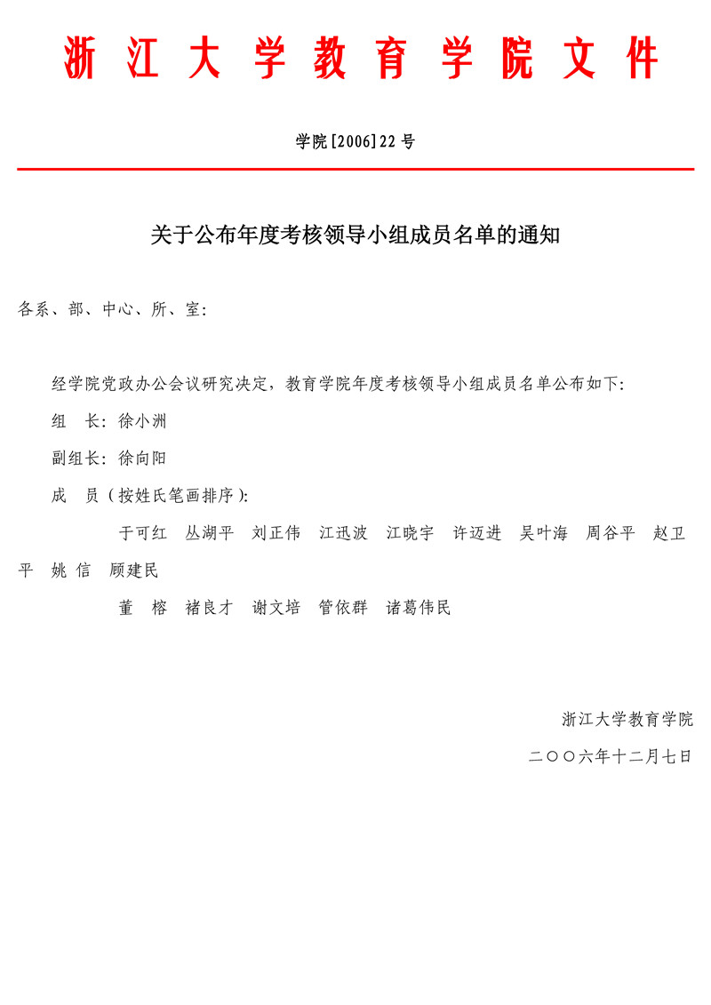学院[2006]22号 关于公布年度考核领导小组成员名单的通知