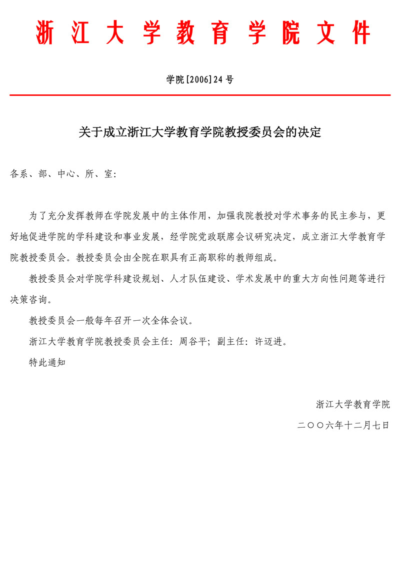 学院[2006]24号 关于成立浙江大学教育学院教授委员会的决定