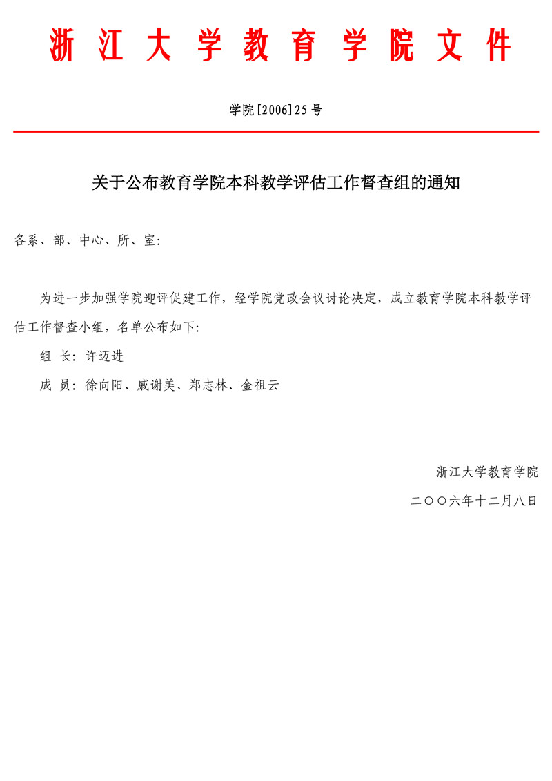 学院[2006]25号 关于公布教育学院本科教学评估工作督查组的通知