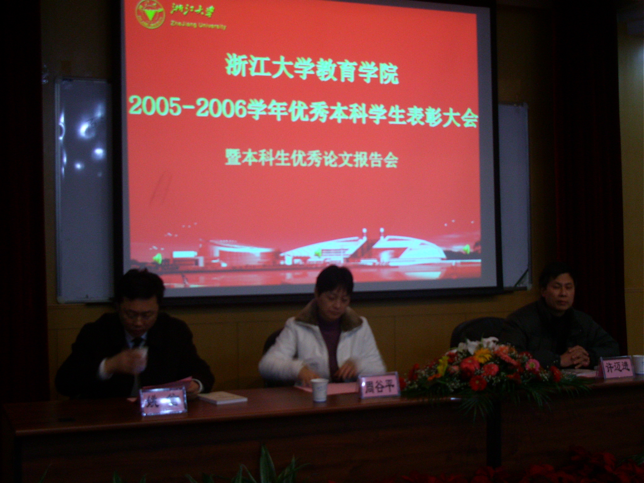 12月20日,浙江大学教育学院2005-2006学年优秀学生表彰大会暨本科生优秀论文报告会在西溪校区田家炳书院506学术报告厅隆重举行。教育学院常务副院长周谷平、党委书记许迈进、党委副书记姚信、教育学系主任刘正伟、教育学系党总支书记赵卫平、体育系党总支书记谢文培、体育学系党总支副书记周永平、团委书记吴建绍、团委副书记汪峰出席了会议。参加会议的还有博士生会主席高云、研究生会主席程艳、学生会主席戴志清。
