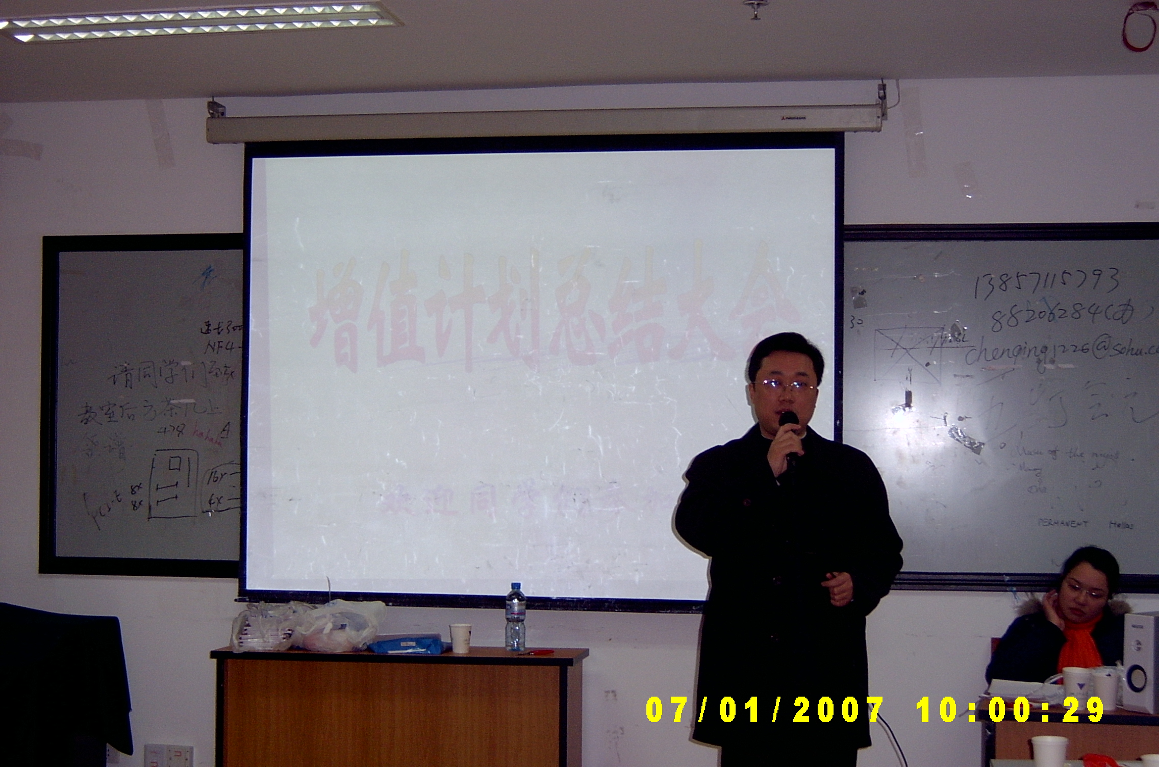 会上,“增值计划”的倡导者、发起人和总指挥、学院党委副书记姚信老师对“增值计划”作了总结。他说,“增值计划”作为一个全新概念的大学新生特别教育计划,得到了学院2006级新生的欢迎和积极参与。从实施过程中看,组织得当,安排缜密,准备充分;同学们积极配合,全身心投入计划的开展,从而保证了学院2006年级新生们在入校后能充分解了自己的性格、潜质、价值观和职业兴趣,较好较快地融入了大学生活和学院大集体,也进一步明确了自己的学习目标和事业路向。“增值计划”基本达到了预期设想的目标。同时他也认真听取了同学们对活动的反馈和提出的建议。