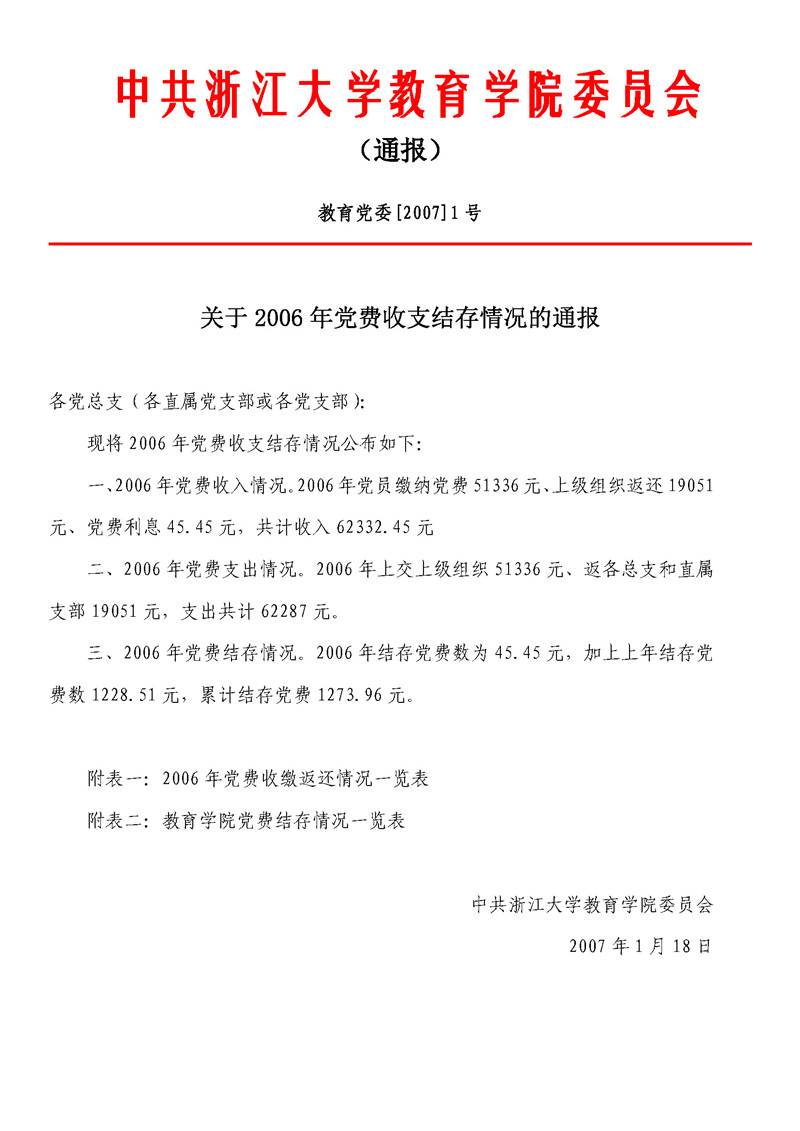 教育党委[2007]1号关于2006年党费收支结存情况的通报