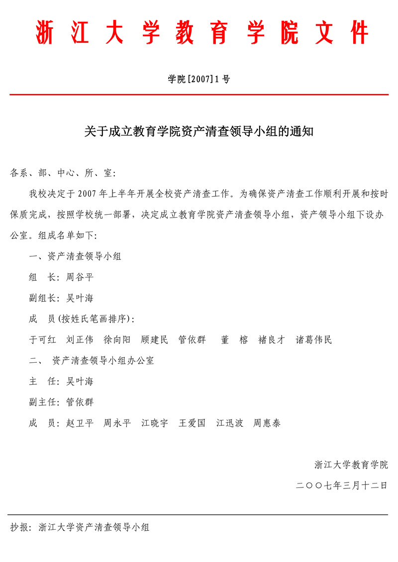 学院[2007]1号 关于成立教育学院资产清查领导小组的通知