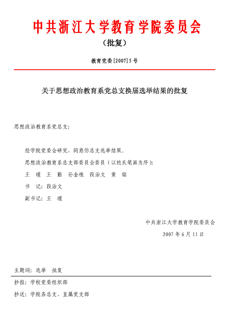教育党委[2007]5号 关于思想政治教育系党总支换届选举结果的批复