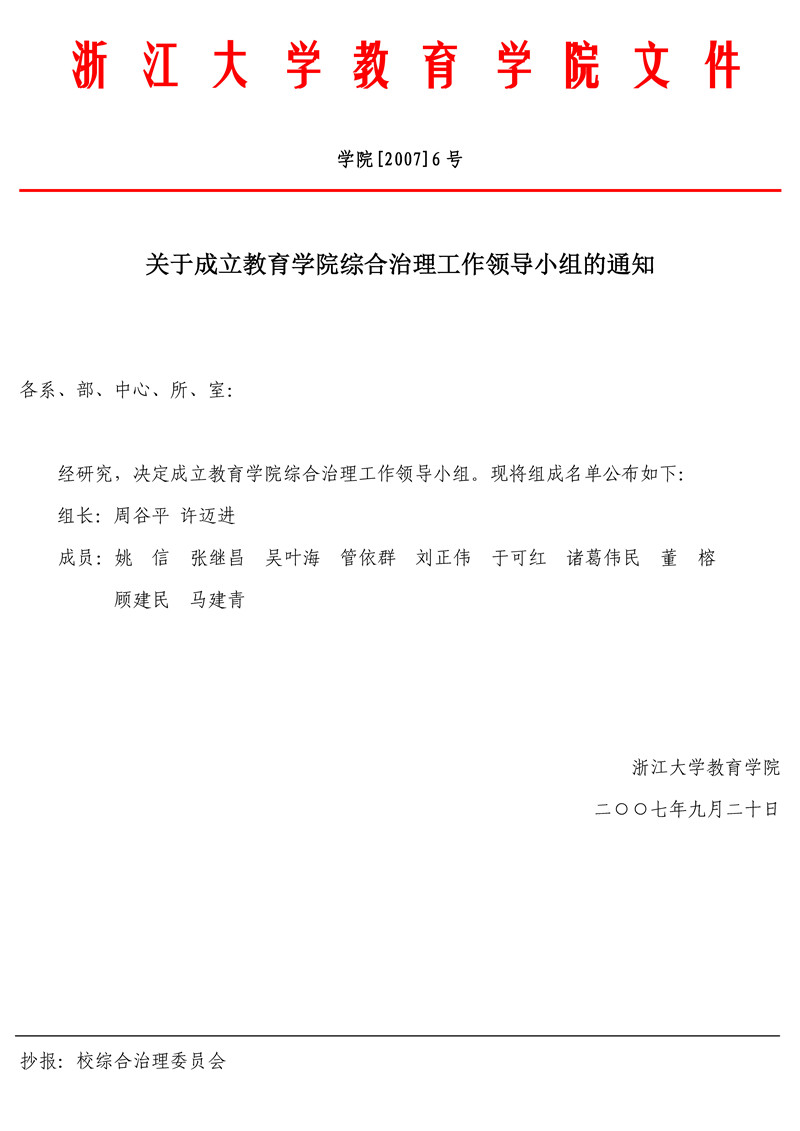 学院[2007]6号 关于成立教育学院综合治理工作领导小组的通知