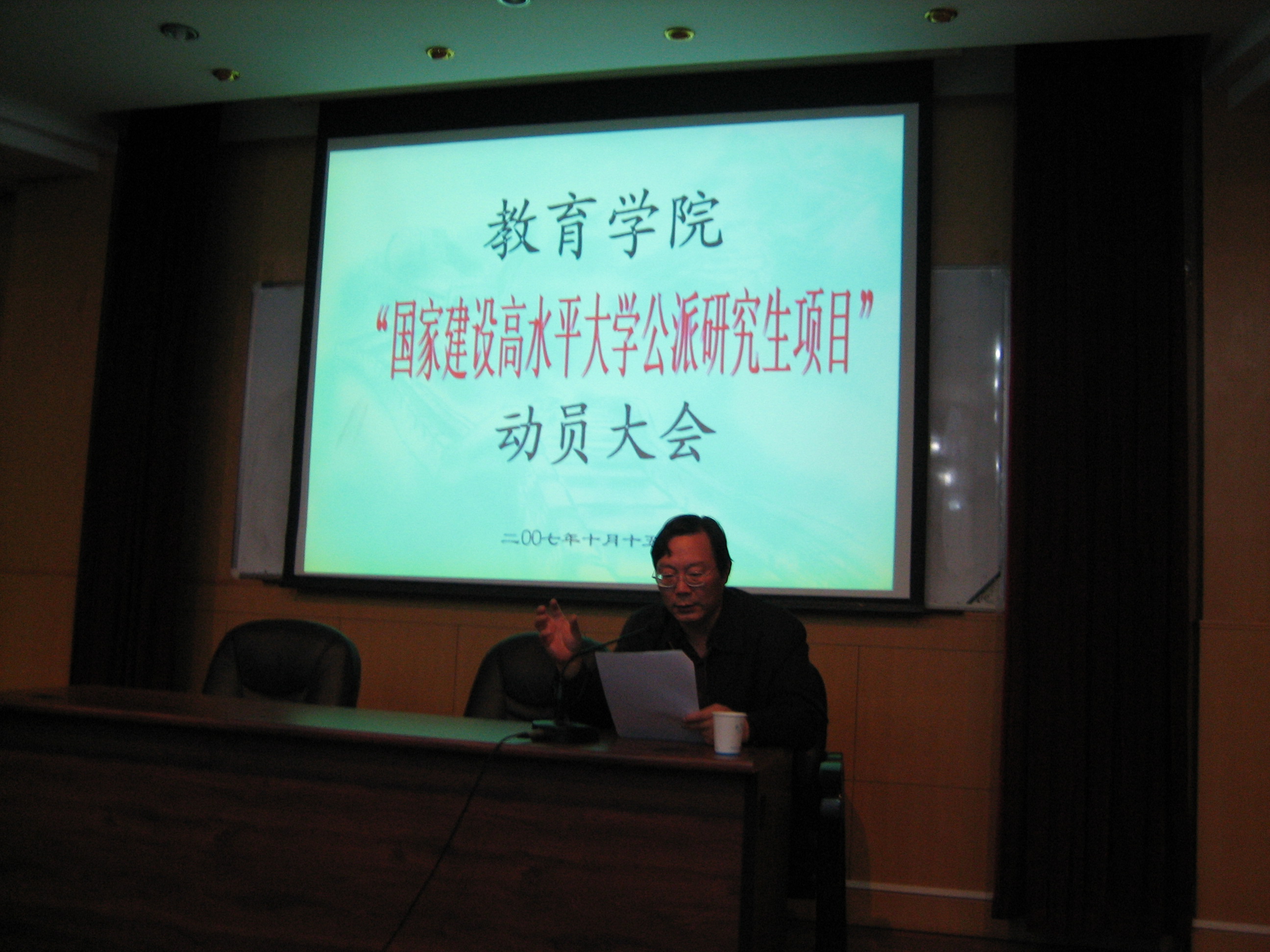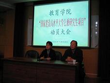 2007年10月15日晚,教育学院在田家炳书院506报告厅顺利召开“国家建设高水平大学公派研究生项目”动员大会。会议由学院副院长丛湖平教授主持,常务副院长周谷平教授、副院长徐小洲教授、党委副书记张继昌教授、各二级学科负责人、全日制研究生参加了此次动员大会。