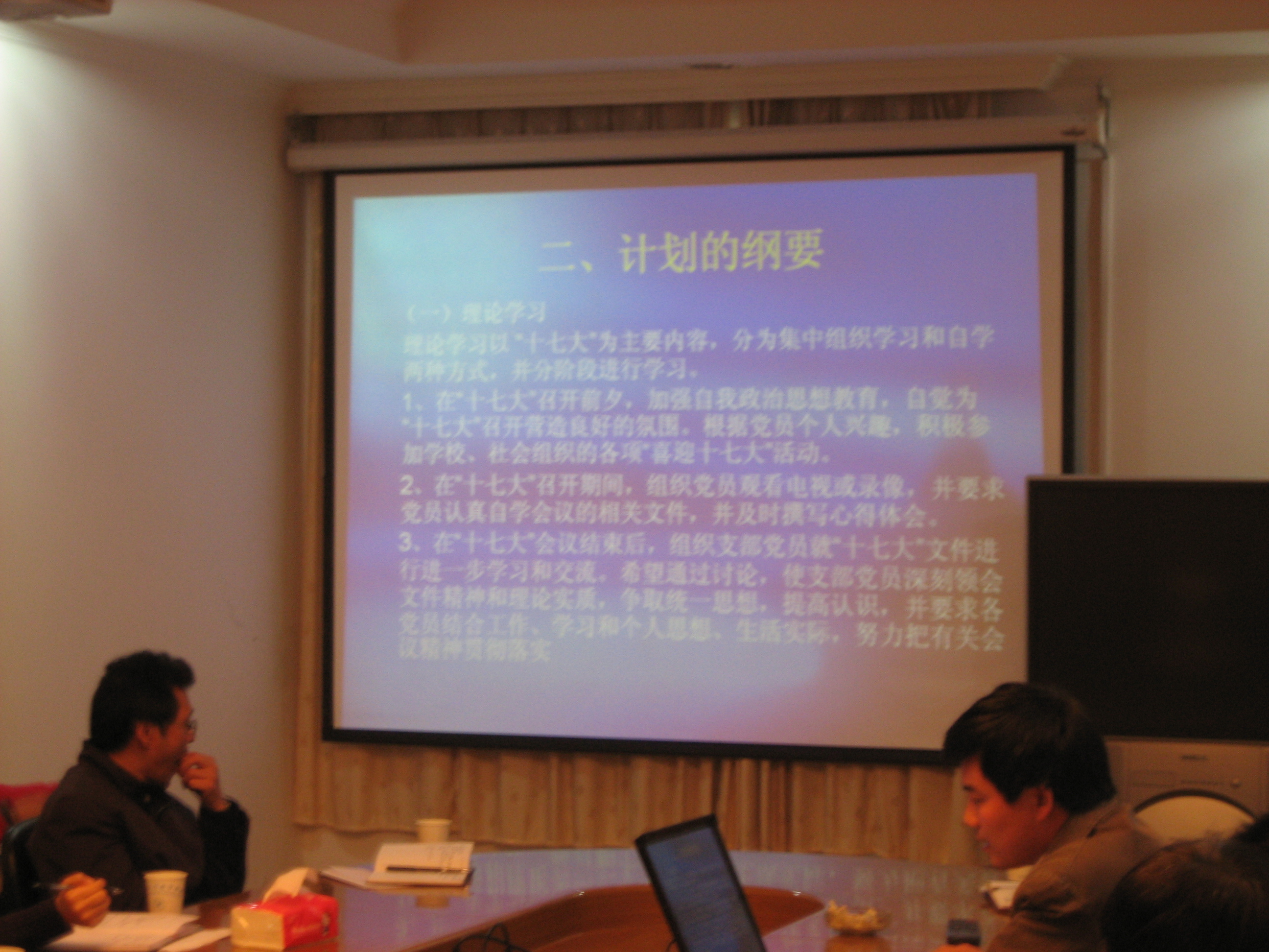 首先,由吴建绍对这次的议题和步骤进行了介绍,其后由各学生党支部通过PPT依次介绍本支部的创建计划和党员代表的个人学习计划。各党支部根据实际情况和专业背景,进行了图文并茂的介绍和交流。每个党支部的计划都有其自身的特点,但均以形成支部的共同愿景,探索保持共产党员先进性长效机制,更好地发挥学生党员在学生中的影响力,更好的发挥学生党员的先锋模范作用为中心。各学生支部学习计划条理清晰,内容明确。