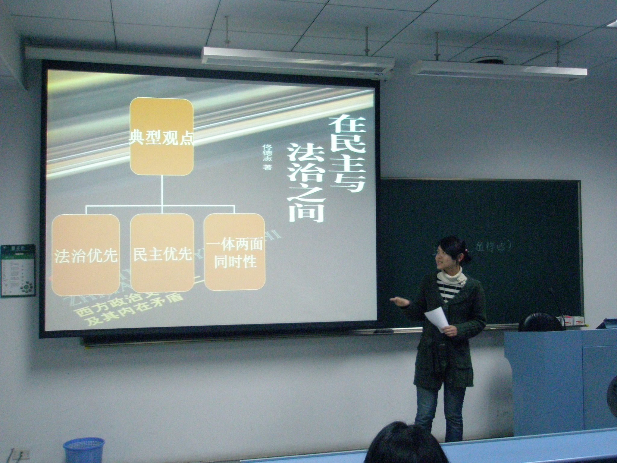 其中给大家留下最深印象的“老师”是来自教育学院2007思想政治教育系的研究生方射娟同学,他为我们上了一堂生动的“基层民主建设”的课。一站上讲台,他从容自若的自我介绍让整个课堂的气氛亲切起来。在接下来的讲课过程中,他由浅入深地向大家阐述了几个关于“民主”、“共和”的概念,并用生动的事例加以图片介绍了目前农村基层民主的发展状况,进而深入一步引发我们对于农村民主建设的思考,并由此得出结论。整个过程中,他不时地走下讲台,与评委和同学进行积极的交流,并用提问等方式与台下的“学生”保持互动,牢牢地抓住了大家的注意力。再加上流畅的表达和丰富的肢体动作,方射娟博得了在座评委的极大好感,拿下了全场的最高得分,成为当晚当之无愧的“最佳教师”。