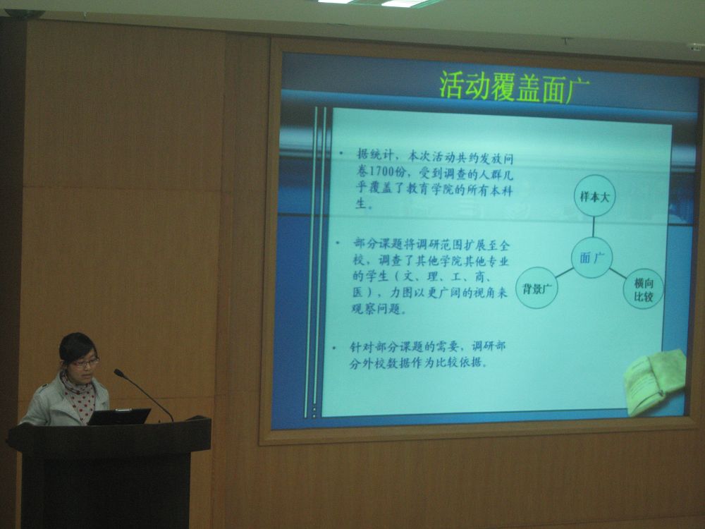 其中,教育学院在比赛中发挥了出色的水平。院学生会学习与实践部长罗芳草通过简明扼要的主题内容介绍,把学院文武双全的特色、别具一格的人才培养模式展示给了现场每一位评委和观众。在接下来的内容中,她介绍了学院调研活动的开展形式以及与之相配合的丰富多采的文化活动,尤其突出了学院活动与经济困难生教育实践相结合的特点。然后,她重点介绍了学院的精品特色项目,不管是构建本硕博互动的“大手牵小手”活动,还是旨在提升学生综合竞争能力的“模拟讲堂”比赛,或是强调促进学生通用技能提高的“增值计划”,都吸引了评委,和在场所有观众的注意。义工之家、校园文化创新大赛等活动更是与青年群体的特点相结合,充分体现了学院以人为本、综合培养的教育理念。最后提出的反思及长效机制更为保持学院优良学风提供了有力的保障。
