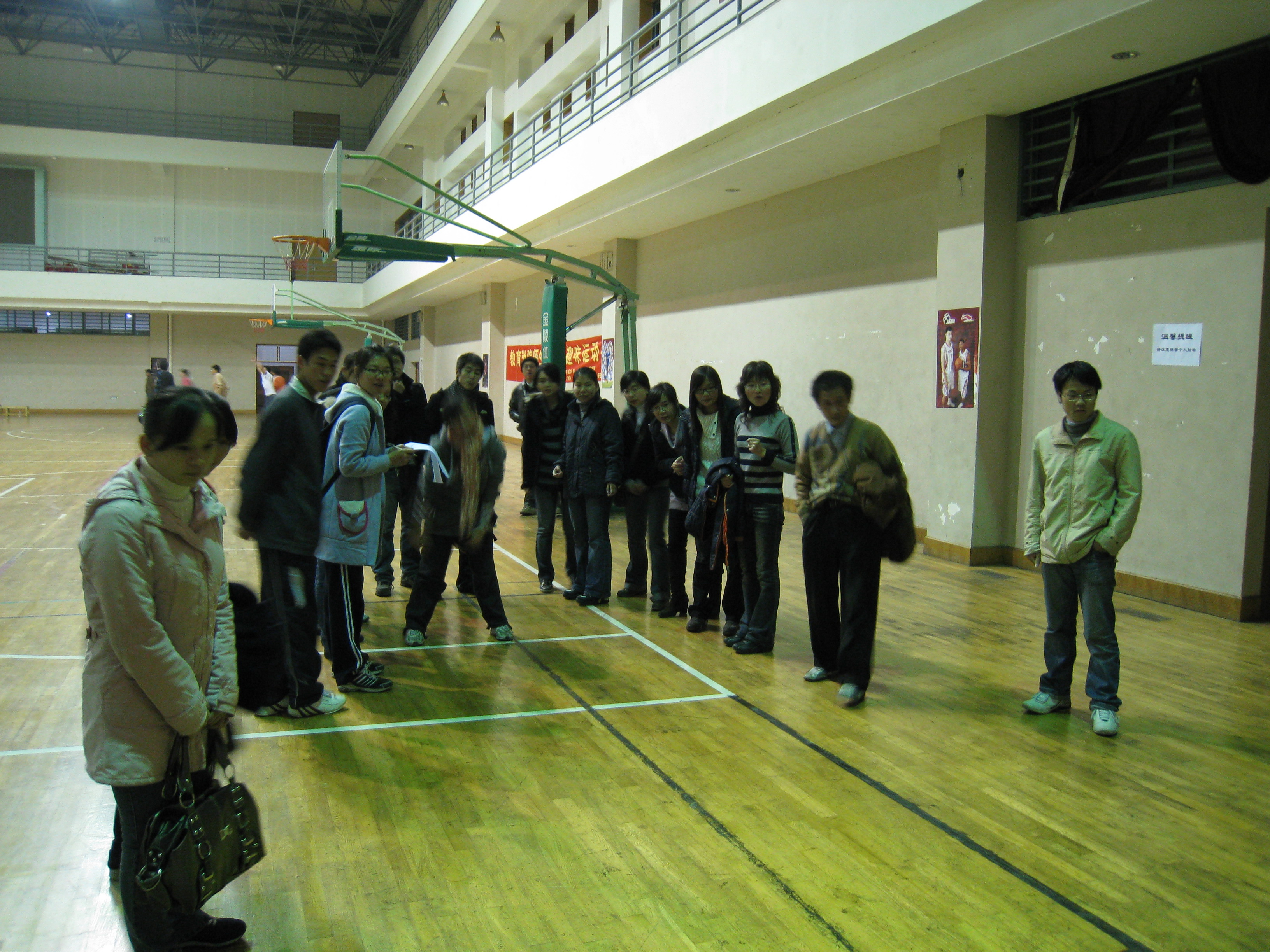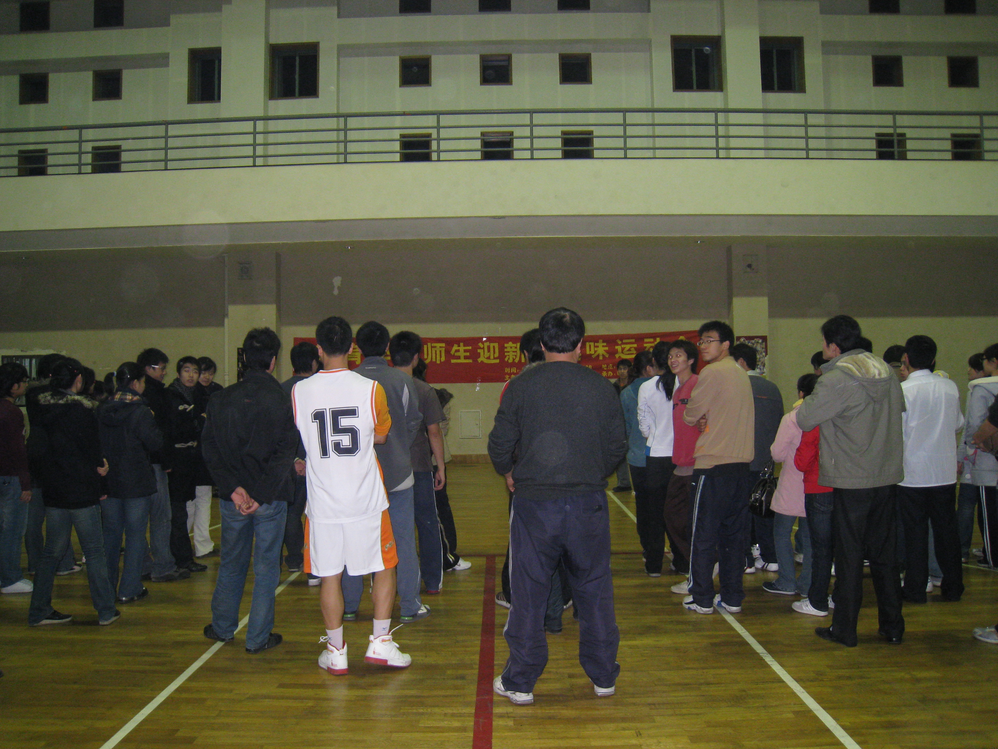 趣味运动会分为两个阶段:趣味比赛和师生篮球赛。在趣味比赛中设有定点投篮、趣味保龄球、托乒乓球等项目。师生自由组队参加,每队5人,至少有一名老师。广大师生积极参与其中,热闹的体育馆里的喝彩声连连,师生的互动融洽而活跃。运动的第二阶段是师生篮球赛,在紧张激烈的比赛中学生队和教工队的比分一直不相上下。教师和学生的精彩比赛引得周围加油声和鼓掌声不断,体育馆里回荡着欢乐。比赛最后以教工队领先学生队20分落下帷幕。