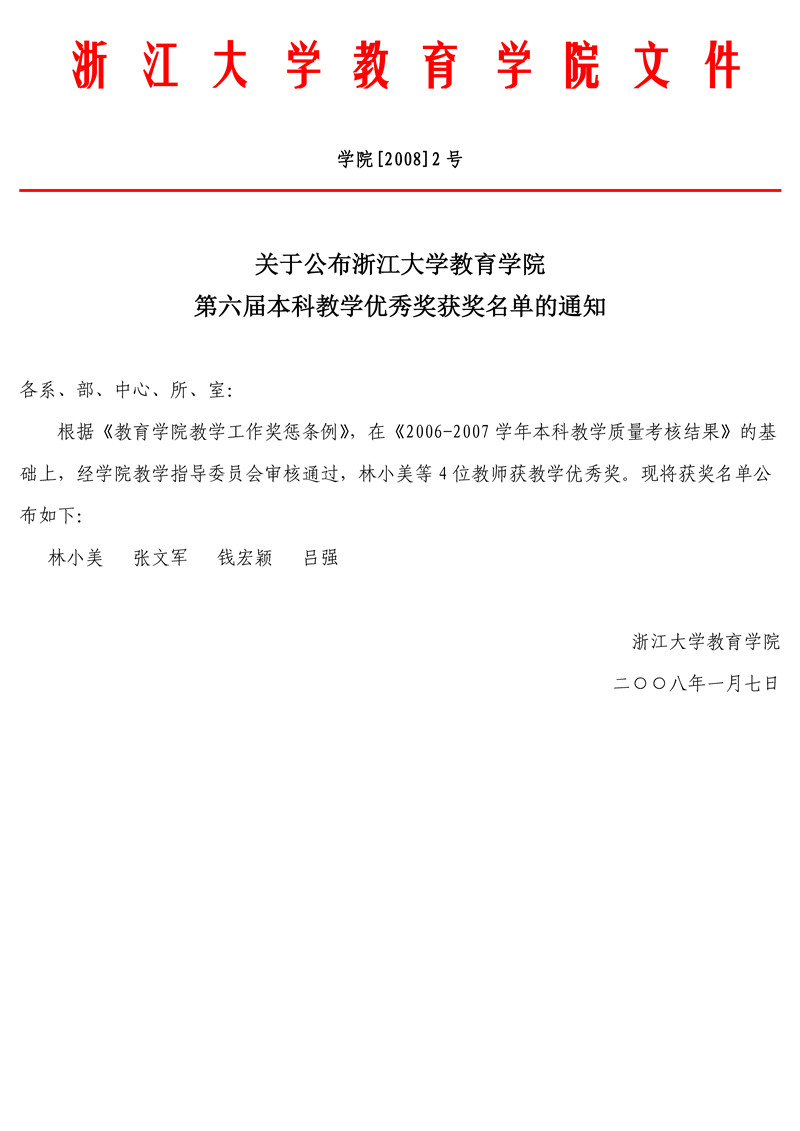 学院[2008]2号 关于公布浙江大学教育学院第六届本科教学优秀奖获奖名单的通知