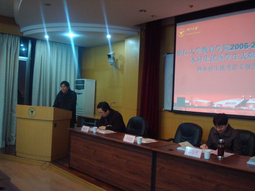 大会第二项内容是教育学院2006—2007学年本科生优秀论文报告会。本次论文报告会专门编印了《2007学年教育学院本科生优秀论文集》,在来自教育学院各年级和专业的30篇论文中,经过各专业教师的评选,共16篇论文入选。报告会上选取了其中3篇以报告形式向师生作展示,三位同学的论文报告思路清晰、内容精彩,在场的同学受益匪浅。最后,学院副院长徐小洲教授对此次论文报告作了精彩的点评。徐老师对同学们“走出教室、走入社会”的求学勇气,深入实际的研究方法以及为社会服务的善心给予了充分的肯定,鼓励同学们积极参与教育研究与调查。同时,徐老师也就如何做好课题研究和如何撰写论文提出了自己的建议,同学们收获良多。