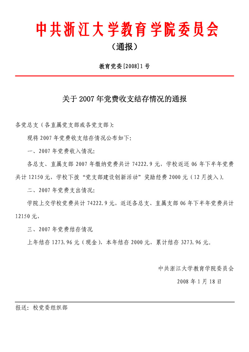 教育党委[2008]1号 关于2007年党费收支结存情况的通报