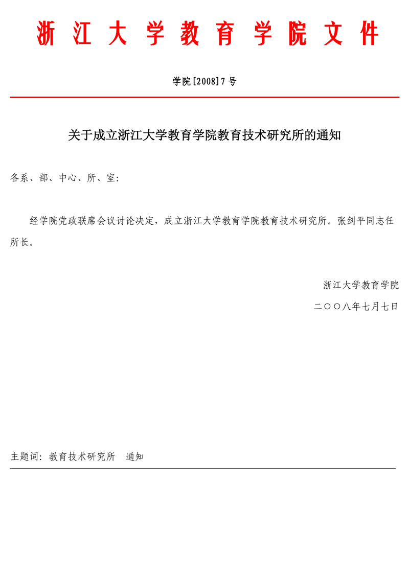 学院[2008]7号 关于成立浙江大学教育学院教育技术研究所的通知