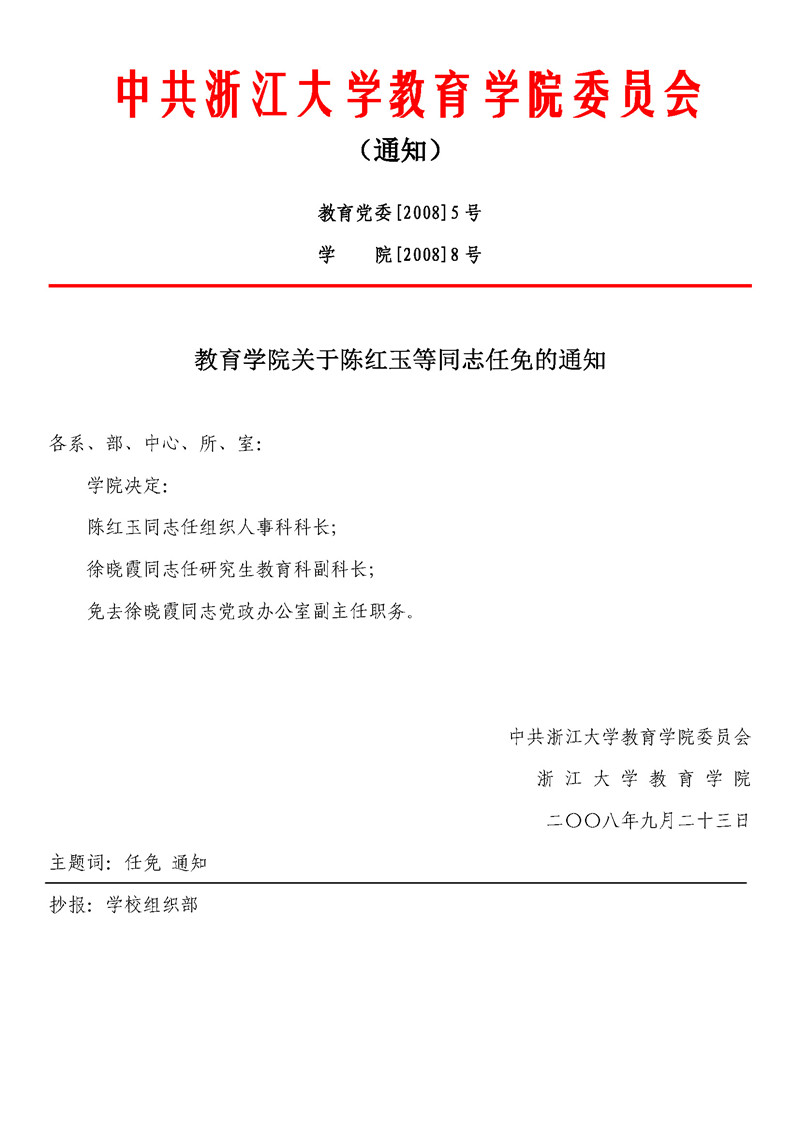 教育党委[2008]5号 中共浙江大学教育学院关于陈红玉等同志任免的通知