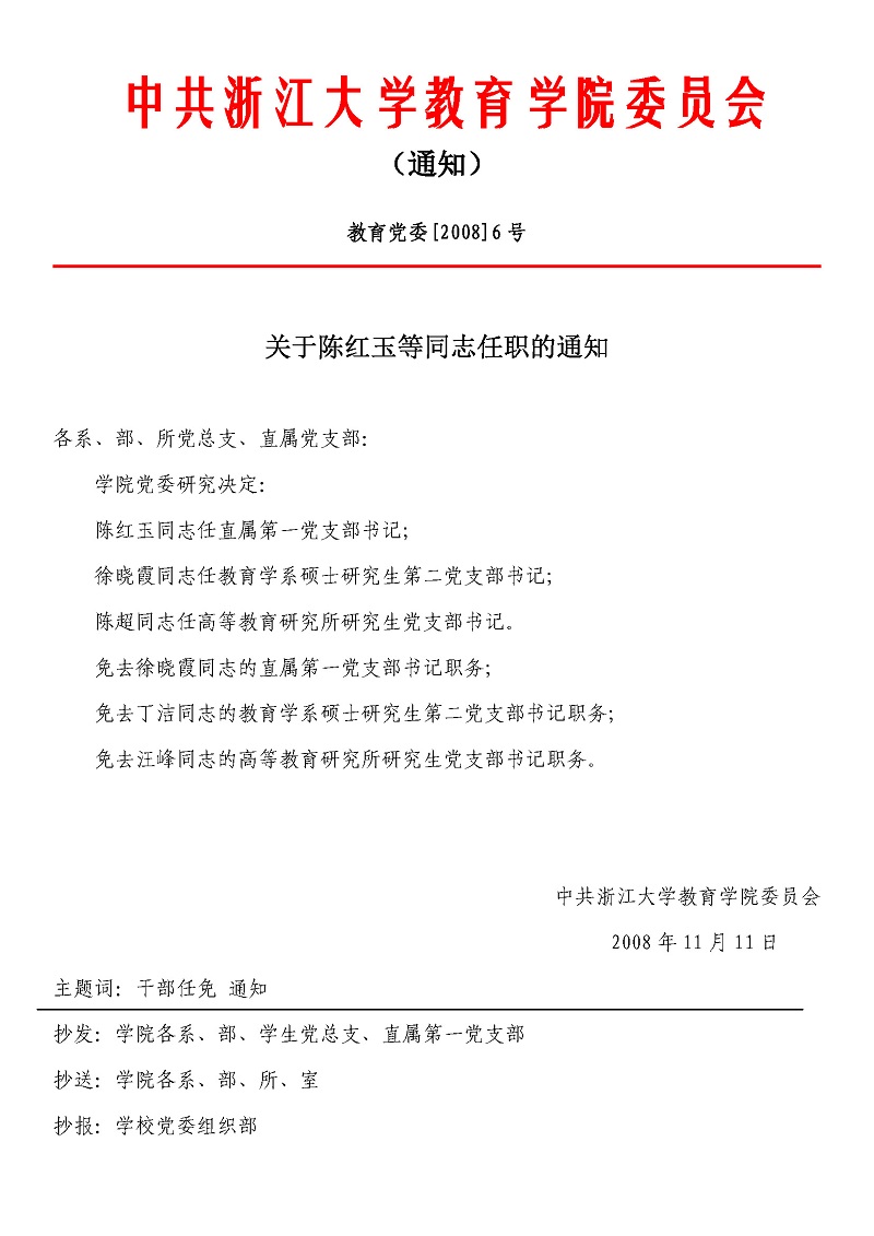 教育党委[2008]6号 中共浙江大学教育学院关于陈红玉等同志任职的通知