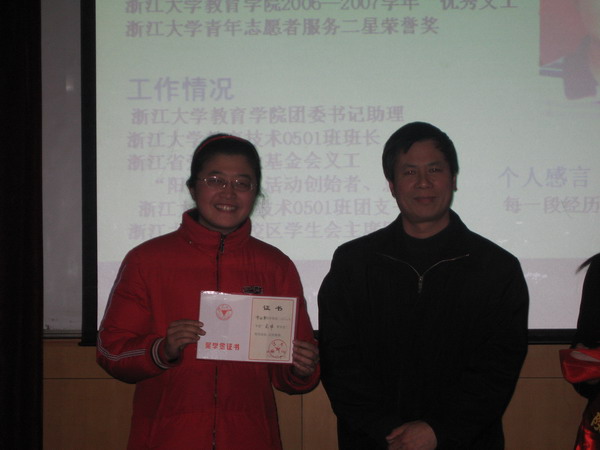 接着,学院党委书记许迈进宣读了各项奖学金和荣誉称号获得者名单。在庄严的进行曲中,学院领导给获得奖学金和荣誉称号的个人、集体代表一一颁发了证书。在颁奖过程当中,为了将优秀的事迹进行宣传和推广,让更多的同学借鉴他们的经验,获得突出荣誉和个人和集体还逐一进行了风采展示。在林坚奖学金获得者的展示中,我们看到了作为优秀学生应该具有的品质和能力;而在先进班级的展示中,我们又看到优秀集体的那股韧劲和团结。教育学0601班用全班同学心声谱出的电子书,形象生动的诠释了一个先进班级带给人的感动与震撼。